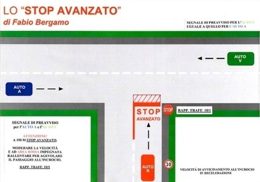 1 Lo Stop Avanzato che perfeziona la disciplina dello stop in ragione delle auto sempre più veloci e numerose, mettendo in comunicazione i veicoli che attraversano l’incrocio e bilanciando altresì l’adozione e l’uso delle rotatorie ereditate dalla Francia; con esso le auto in transito sulla strada principale, avranno solo l’obbligo di rallentare e far passare l’auto che, dopo aver atteso il suo turno come previsto dalla segnaletica prevista, attraverserà l’incrocio in sicurezza e senza creare intralcio per la circolazione, dopo essersi spostata nell’area antistante la striscia trasversale di arresto (red area); negli incroci dove sarà installato nessuna auto, pur di passare, andrà più contromano, come spesso si verifica, sulla pretesa dello spettante diritto di precedenza, come avviene adesso agli incroci dotati del tradizionale stop. Tale sistema dunque, migliora grandemente la disciplina dello stop e prevede una adeguata sanzione per chi non rispetta la segnaletica che lo regola nella sua funzione.