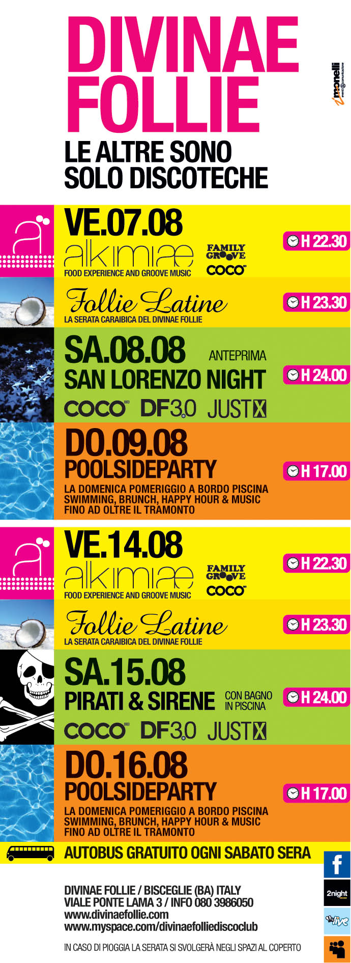 Il weekend più lungo, esplosivo e divertente dell’estate targato Divinae Follie inizierà come ogni venerdì con Follie Latine, la serata riservata a tutti coloro che vorranno scatenarsi con i ritmi più coinvolgenti e caldi di quest’estate. L’invito è esteso agli addetti al settore, appassionati e amanti della musica latina. Al Divinae Follie, come ogni venerdì vivrete la notte più salsera che ci sia con i suoni dei latin-j Silvio Sisto e Pino Valerio. In collaborazione con le migliori scuole di ballo della provincia.