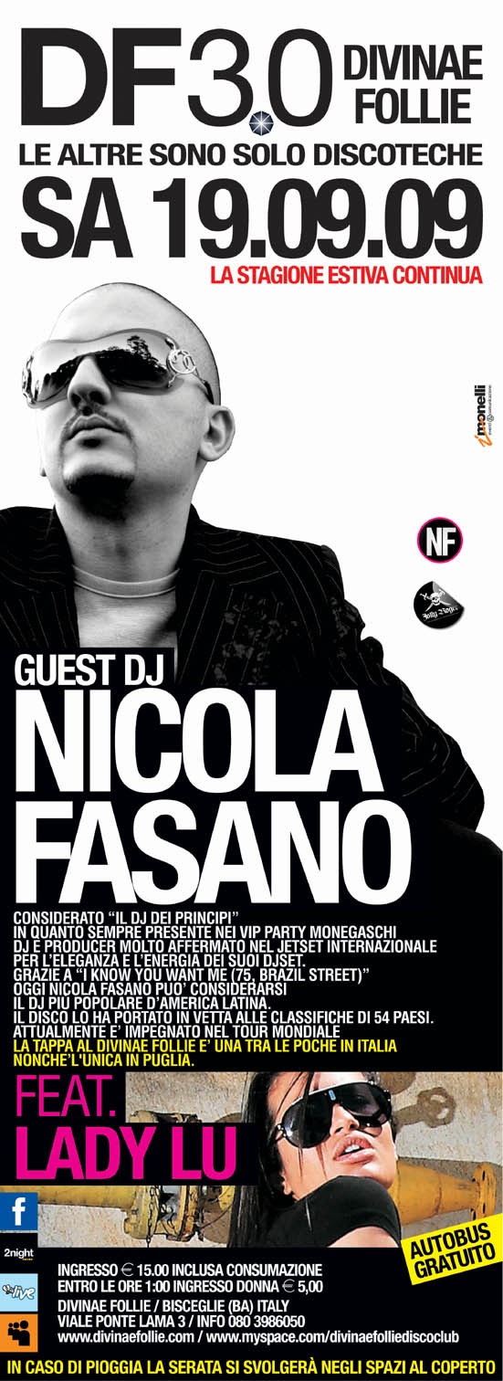L’estate Divinæ Follie presenta ancora un altro grande appuntamento con uno delle star house più richiesti al momento, il dj e produttore Nicola Fasano e la voce di Lady Lu, che accompagna i suoi dj set.
