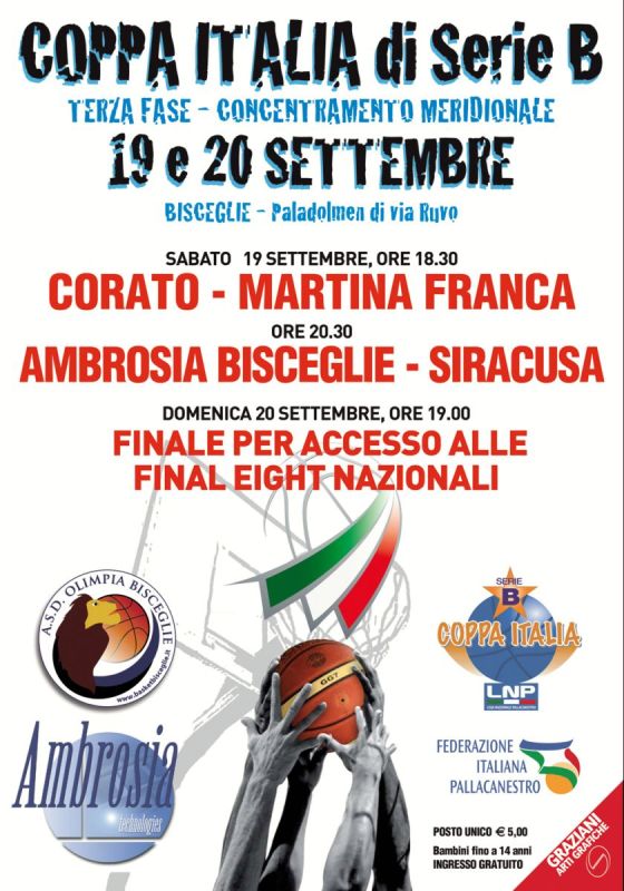 All’interessante antipasto che precede di una settimana l’esordio dei nerazzurri nella quarta serie nazionale prenderanno parte anche Corato, Martina Franca e Siracusa. Il programma del ricco weekend cestistico sul parquet dell’impianto di Via Ruvo partirà con lo svolgimento delle semifinali di domani pomeriggio: alle 18.30 scenderanno in campo Corato e Martina Franca, mentre alle 20.30 i padroni di casa dell’Ambrosia sfideranno il Siracusa, altra neopromossa in serie B. Le vincenti si contenderanno domenica, con palla a due alle 19, il successo che garantirà l’accesso alla Final Eight di Coppa Italia.