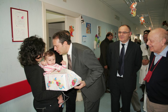 Nella mattinata di Venerdì 25 dicembre, in occasione del Santo Natale, il Sindaco di Bisceglie Francesco Spina ha inteso far visita al reparto di Pediatria dell’Ospedale di Bisceglie. Nell’occasione, accolto dai Primari Dott. Carlo Di Terlizzi e Dott. Tommaso Fontana, ha voluto consegnare personalmente pacchi dono ai piccoli degenti. Lo hanno accompagnato nella visita al nosocomio biscegliese il Sen. Antonio Azzollini, il Presidente del Consiglio Comunale Angelo Belsito, l’assessore ai servizi sociali Alfonso Russo.