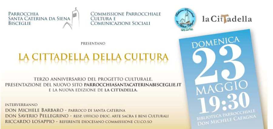 Appuntamento culturale di rilievo domenica 23 maggio alle 19,30, presso la Biblioteca Parrocchiale “Don Michele Cafagna”. La Parrocchia di Santa Caterina e la Commissione Parrocchiale Cultura e Conunicazioni Sociali presentano una conferenza dal tema “LA CITTADELLA DELLA CULTURA”, terzo anniversario del progetto culturale, presentazione del nuovo sito internet www.parrocchiasantacaterinabisceglie.it  e della nuova edizione del periodico “La Cittadella”.