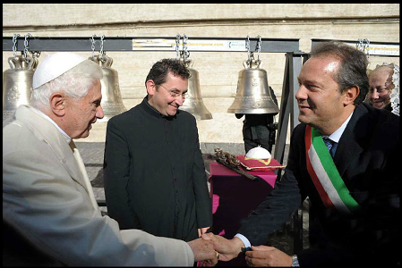 In una splendida giornata di sole, don Franco Di Liddo, parroco fondatore della chiesa di Sant’Andrea, don Mauro Camero, rettore della Concattedrale ed il sindaco della Città di Bisceglie, avv. Francesco Spina, hanno atteso sul sagrato di San Pietro l’arrivo di Benedetto XVI. Il Santo Padre dopo aver benedetto le pregevoli campane, si è intrattenuto in udienza privata, durata oltre mezz’ora, con i prelati e con il Sindaco a cui ha affidato un caro messaggio di saluto e le sue benedizioni per tutti i cittadini biscegliesi. «L’incontro con Sua Santità Benedetto XVI, eminente guida spirituale dell’umanità, ha rappresentato uno dei momenti più intensi della mia esperienza di sindaco», ha commentato l’avv. Francesco Spina