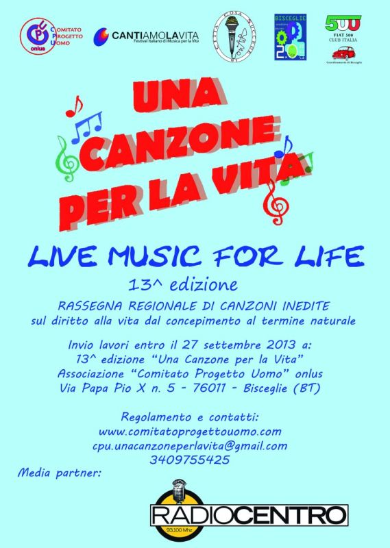 Giunge alla tredicesima edizione il Festival musicale organizzato dal “Comitato Progetto UOMO” di Bisceglie “Una canzone per la Vita”.
