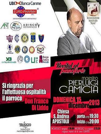 Ci sono altre due notizie che voglio porgervi: Il Maestro Camicia, pianista nato, ha avuto tanti allievi biscegliesi ed inoltre,ha un affetto particolare per Bisceglie perchè ha parenti biscegliesi,conosce la realtà culturale di Bisceglie,ed è particolarmente felice e fiero di poter suonare per noi.Mi piace comunicarvi alcuni tra i tanti allievi biscegliesi che sono certo verranno ad ascoltarlo e a salutarlo: il Pianista biscegliese Giuseppe Campagnola, il Pianista Enzo Rana padre della celebre Beatrice Rana ed ancora Domenico Di Leo, Maria Teresa Di Terlizzi, Terry La Notte, Marilisa Petruzzi ecc. E come non ricordare quella lontana Stagione musicale 1979/1980 quando organizzato dal Comandante La Notte, Camicia tenne concerti a Bisceglie con Giuseppe Campagnola, Hector Pell, Francesco Lentini ecc. Una lunga gloriosa carriera quella del Maestro Camicia, Direttore del Conservatorio misicale “Tito Schipa” di Lecce. E, per finire il “grazie” alla Banca UBI, il cui Direttore ha proposto ed ottenuto un patrocinio economico per il Concerto, all’Azienda Euro Pharma del Dott Mario Miscioscia biscegliese a Torino che mi è stata sempre e da sempre vicino, al Parroco Don Franco Di Liddo, che con pazienza affetto e calore umano ci accoglie per un’altra volta e tutte le benemerite Associazioni biscegliesi, senza il cui contributo in termini di presenza, di affetto e di condivisione tutto ciò che ho organizzato in veste di presidente della Fonè, non avrebbe avuto di certo il successo che ha avuto ed ha: l’ANT, la Pro-Loco, l’ADISCO, il Circolo UNIONE, il Rotary Club, l’Associazione Nazionale Marinai d’Ialia, l’UNUCI, la FIDAPA, il Lions Club, il Rotaract, l’Interact, la Soc. di Mutuo Soccorso “Roma Intangibile”, lo Sporting Club Bisceglie, il Club UNESCO, l’ UNITRE, l’Associazione “Borgo Antico”, il Centro Studi Bisceglie e non da ultima l’Archeoclub.