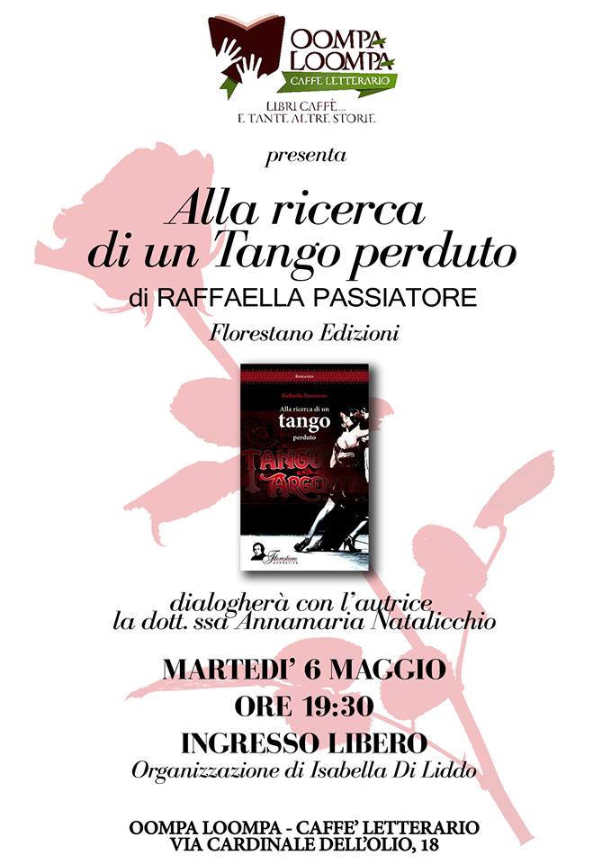 Dopo il grande successo ottenuto col romanzo “Un amore in cerca d’autore”, giunge a Bisceglie la tanto attesa scrittrice Raffaella Passiatore, ospite del caffè letterario, la libreria “Oompa Loompa”. L’autrice, già premio letterario Vienna “Scrivere tra le Culture” 2004, presenterà il suo ultimo romanzo “Alla Ricerca di un Tango Perduto”, Florestano Edizioni, dialogando con la dott.ssa Annamaria Natalicchio.