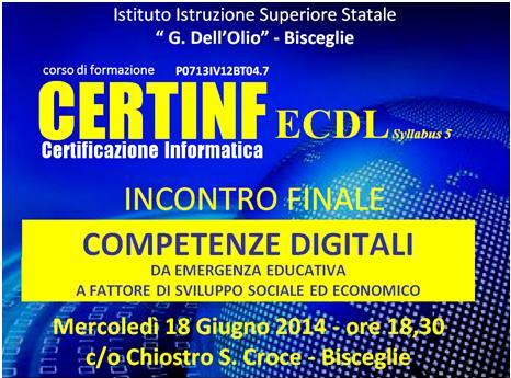 COMPETENZE DIGITALI: DA EMERGENZA EDUCATIVA A FATTORE DI SVILUPPO SOCIALE ED ECONOMICO che si terrà Mercoledì 18 Giugno 2014, presso il chiostro di S. Croce a Bisceglie, con inizio alle ore 18,30.
