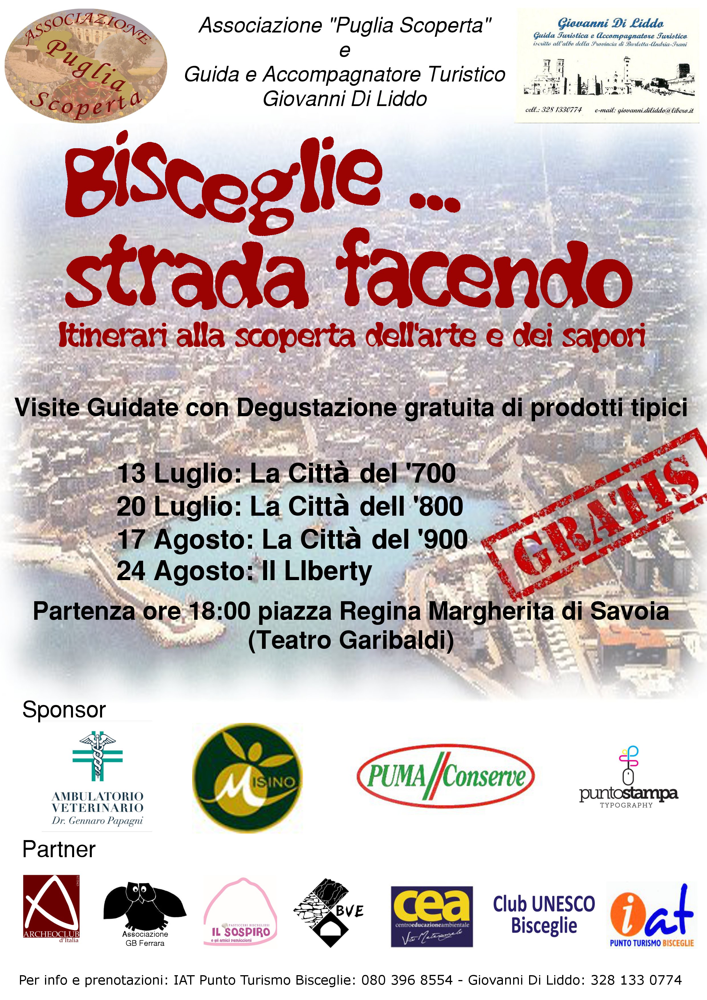 locandina - bisceglie strada facendoDomenica 13 luglio debutterà la prima edizione di  “Bisceglie…Strada facendo” , evento promosso e organizzato dall’ Associazione Puglia Scoperta e da Giovanni Di Liddo, guida e accompagnatore turistico.