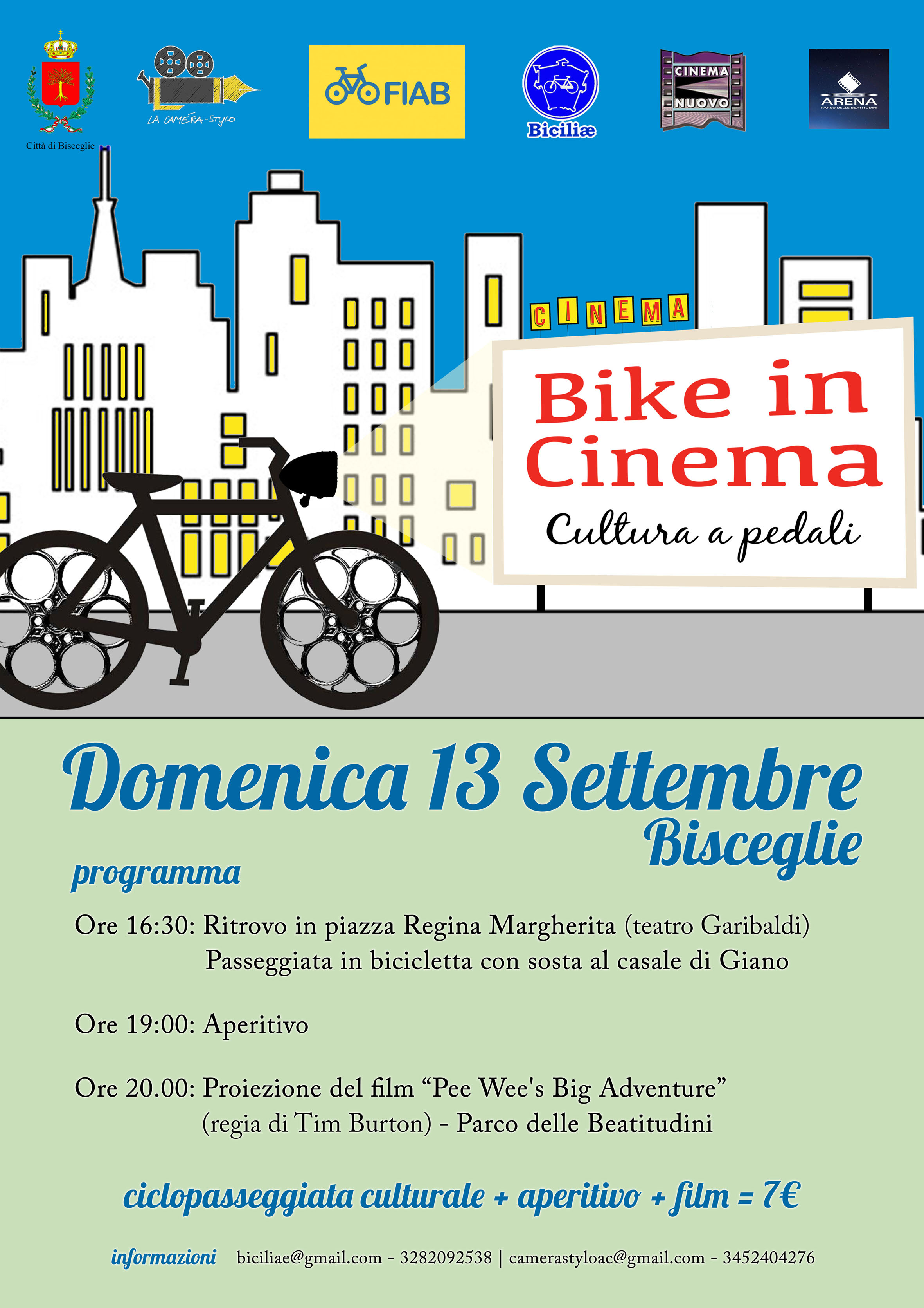 L’itinerario si concluderà nella splendida cornice del parco delle Beatitudini di Bisceglie con la proiezione del film per grandi e bambini “Pee-Wee’s big adventure” regia di Tim Burton. Il film, che quest’anno compie 30 anni, racconta la storia di Pee Wee e della sua amata bicicletta.