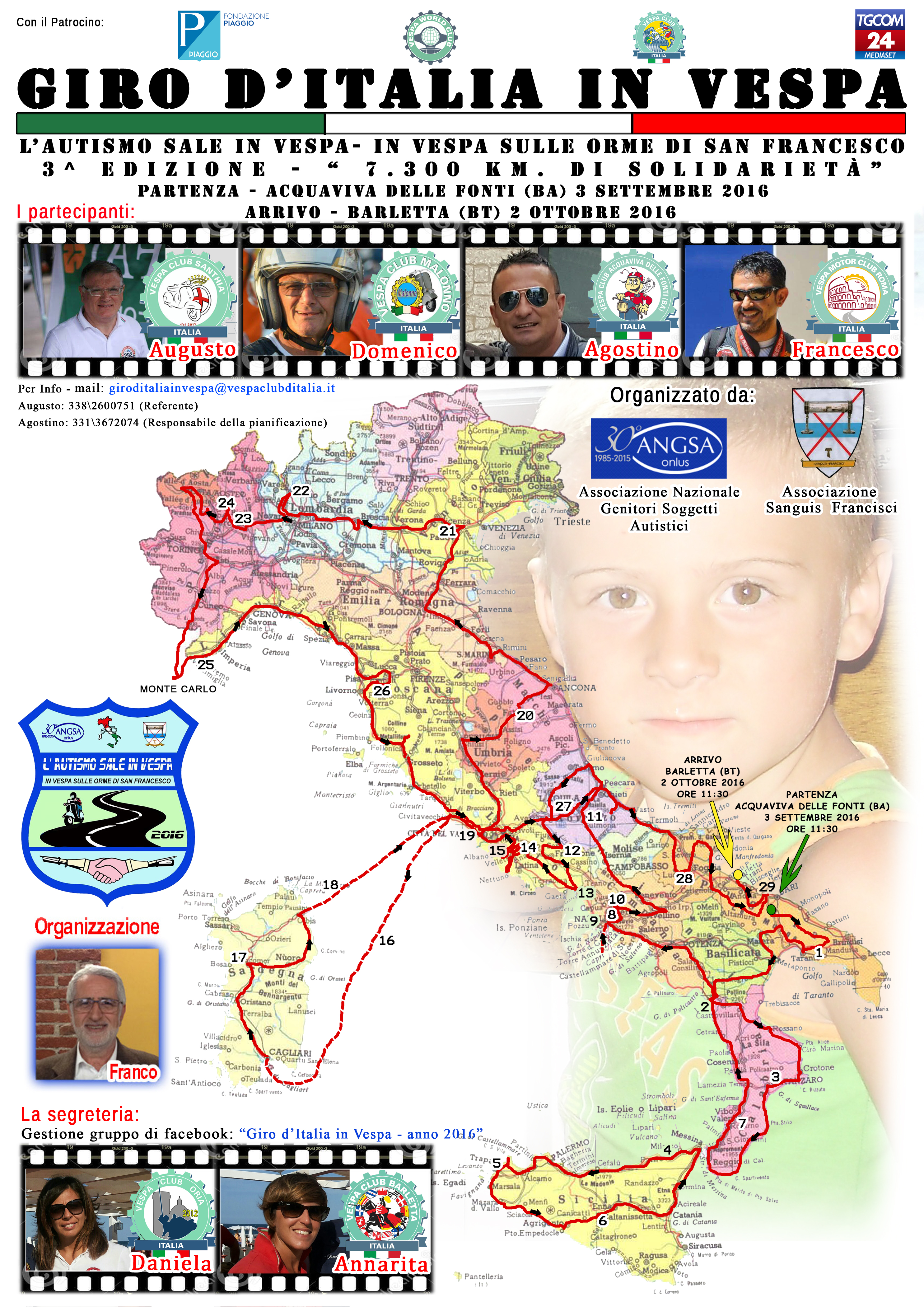 In occasione del 70° anniversario della costruzione della Vespa, l’ANGSA (Associazione Nazionale Genitori Soggetti Autistici) e l’Associazione Sanguis Francisci, unitamente ai quattro organizzatori e partecipanti, Augusto GAUDINO, Domenico GELMI, Agostino MASTROROCCO e Francesco MURONI rispettivamente membri dei Vespa Clubs di Santhià (VC), Malonno Valcamonica (BS), Acquaviva delle Fonti (BA) e Roma, organizzano la 3ª Edizione del giro d’Italia in Vespa, edizione caratterizzata anche dalla presenza di due Vespiste Daniela ARIANO del Vespa Club Oria (BR) e Annarita LANOTTE del Vespa Club Barletta (BT), le quali faranno da corollario al quartetto durante le tappe in Puglia e Basilicata e si occuperanno della gestione della segreteria, della pagina/gruppo di Facebook e di internet. Questa edizione si snoderà per tutto il territorio Nazionale con partenza da Acquaviva delle Fonti (BA) il giorno 3 settembre 2016 e, dopo trenta giorni di viaggio e alla percorrenza di circa 7.300 Km. circa, si concluderà il 2 ottobre 2016 con arrivo nella città di Barletta (BT). Durante il percorso, le staffette dei 159 Vespa Clubs accreditati all’evento, accoglieranno ed accompagneranno i protagonisti di questa “avventura” nel corso dei passaggi e delle soste nelle varie località interessate dal Giro. Questa “Fatica” ha per scopo la raccolta di fondi per l’ANGSA e l’Associazione Sanguis Francisci, entrambe associazioni senza fini di lucro, al fine di sensibilizzare l’opinione pubblica sul problema dell’Autismo che attualmente interessa circa 500.000 famiglie italiane e per consentire la messa in sicurezza dell’impianto elettrico della Chiesa di San Francesco d’Assisi in Castelvecchio Subequo (AQ) ove è custodita la reliquia con il sangue delle stimmate del Santo. A tale scopo, nei luoghi di passaggio, saranno organizzati incontri ed eventi illustrativi ai quali presenzieranno i protagonisti del giro d’Italia in vespa che saranno a disposizione per rispondere a qualsiasi quesito.