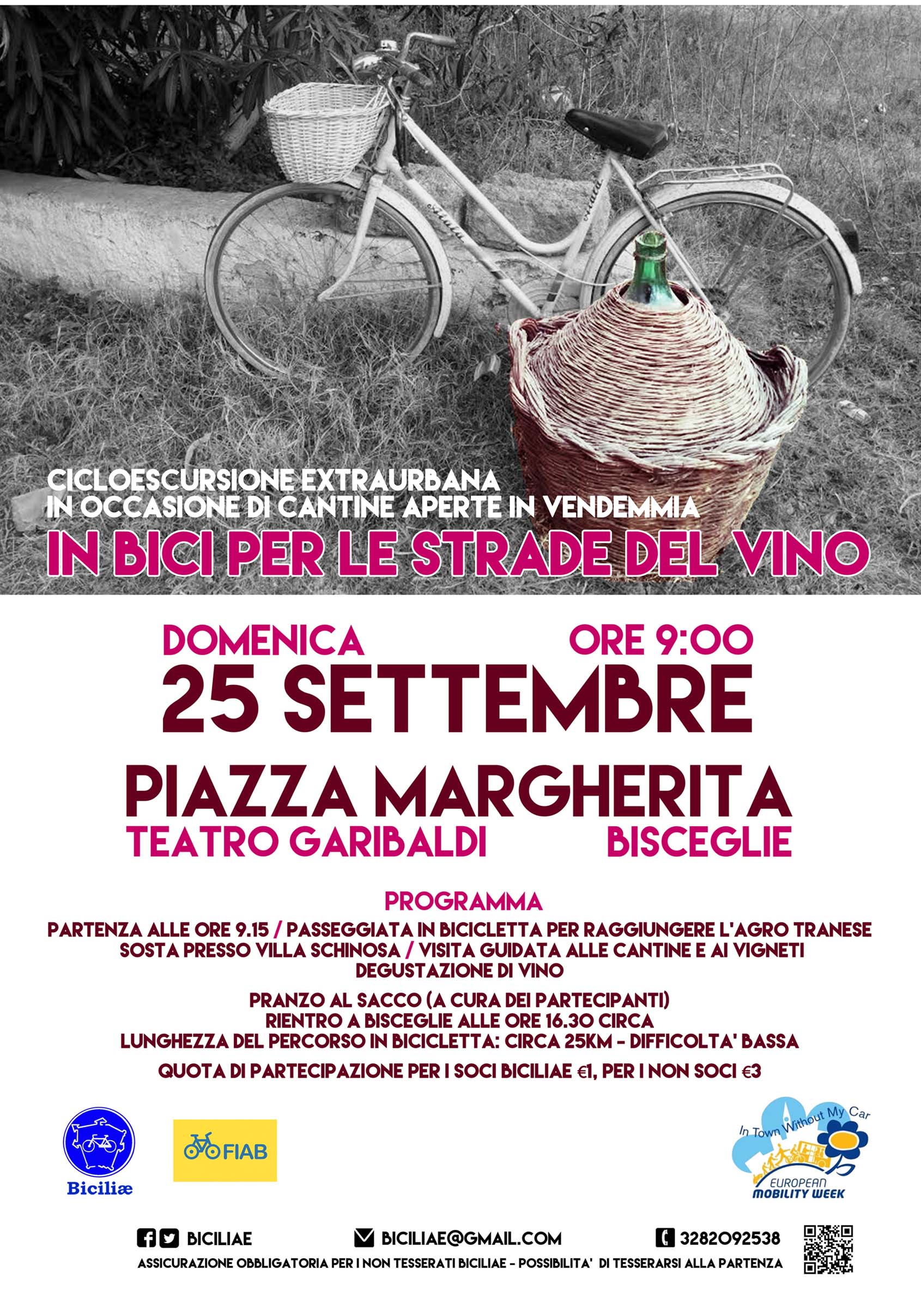 Cicloescursione extraurbana in occasione di Cantine Aperte in Vendemmia* Se un tempo con i piedi si pigiava l'uva, oggi schiacciamo i pedali delle nostre bici per andare a percorrere le vie della tradizione dell'uva e della produzione di vino. Biciliæ FIAB va extraurbano e ti invita a trascorrere una domenica sostenibile, scoprendo in bici le tradizioni del nostro territorio. L’appuntamento è per *DOMENICA 25 Settembre*, *ritrovo alle ore 9.00 in piazza Margherita di Savoia (Teatro Garibaldi) – Bisceglie*. Si raccomanda puntualità per permettere le operazioni di iscrizione. Il programma prevede: partenza alle ore 9.15, passeggiata in bicicletta per raggiungere l’agro tranese. Sosta presso Villa Schinosa, visita alle cantine e ai vigneti, degustazione di vino. Pranzo al sacco (a cura dei partecipanti). Rientro a Bisceglie alle ore 16.30 circa.
