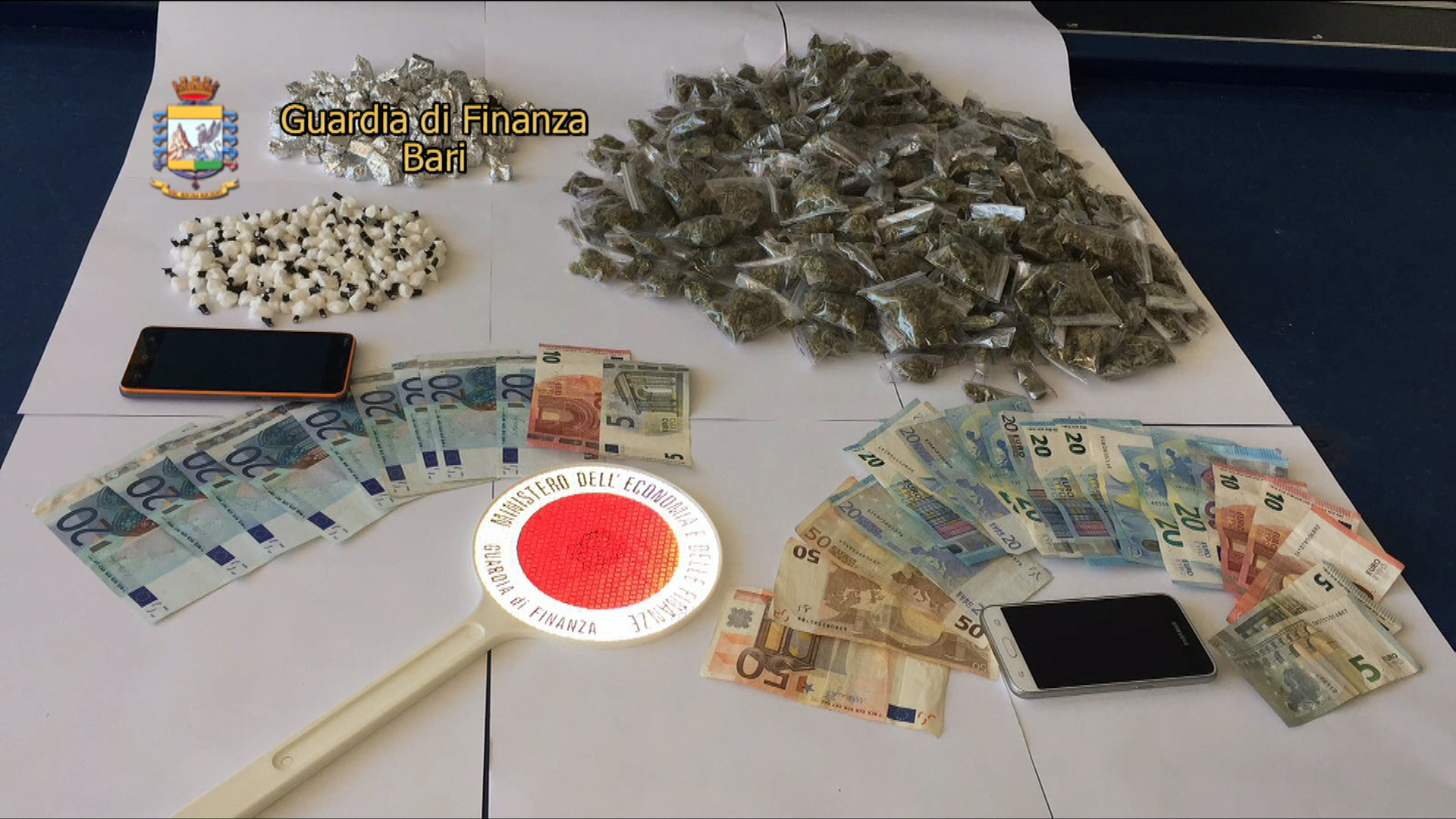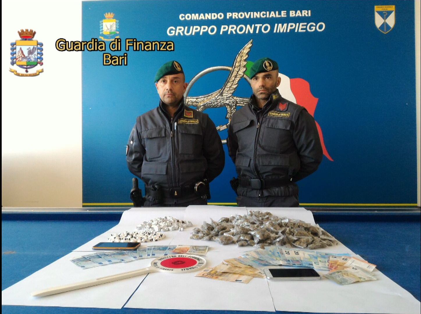 gdf bari_FOTO2Nel corso della perquisizione è stato rinvenuto un borsone con circa un chilogrammo di sostanze stupefacenti, tra cocaina, hashish e marijuana. 600 le dosi sequestrate, già perfettamente confezionate e pronte per essere vendute, oltre a denaro contante e telefoni cellulari, utilizzati presumibilmente per mantenere i contatti con acquirenti e “grossisti” della droga. Il quantitativo, venduto al dettaglio, avrebbe fruttato oltre 25.000 euro. I due spacciatori, giovanissimi pregiudicati di 20 e 21 anni, entrambi di Bitonto, sono stati arrestati e condotti ai domiciliari. Dovranno rispondere del reato di “detenzione ai fini di spaccio di sostanze stupefacenti o psicotrope”.
