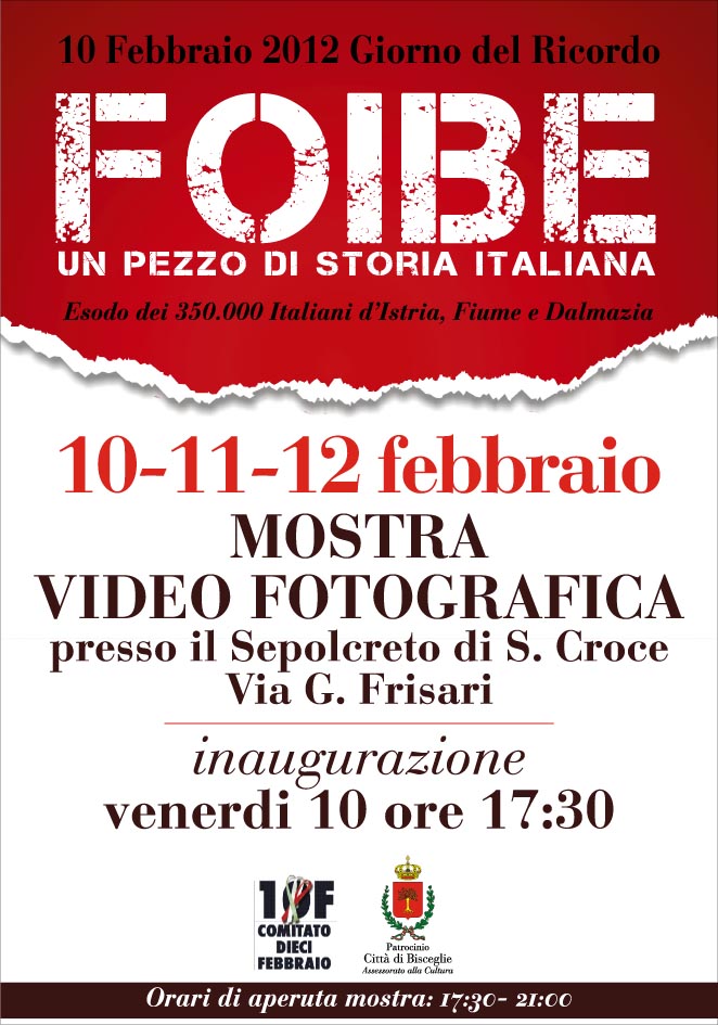 In occasione del “Giorno del Ricordo”, ricorrenza istituita con legge dello Stato n. 92 del 2004 in suffragio delle vittime delle foibe e degli esuli Giuliani, Fiumani, Istriani e Dalmati, il “Comitato 10 Febbraio”di Bisceglie organizza una mostra video fotografica con l’intento di far riscoprire ai propri concittadini un triste periodo della storia del nostro Paese. Continua a leggere